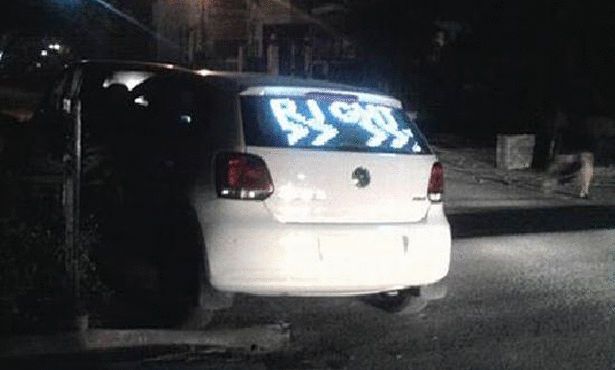 وفق الصور التي عرضتها صحيفة 'ديلي ميل' البريطانية فاللوحة التي وضعها سينغ في سيارته الفولكس فاغن تعرض إشارات مثل 'قيادة بطيئة' أو 'احتفظ بالمسافة بين السيارتين'.