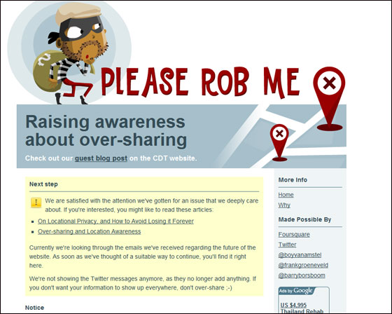 انتشرت "موضة" جديدة في الاونة الاخيرة تتمثل في نشر مواقع تواجد الاشخاص خارج بيتهم عبر مواقع كثيرة مثل "فيسبوك" و"تويتير". وقد أسس 3 شباب هولنديون موقعاً على الانترنت أطلقوا عليه اسم ((Please Rob Me.com أي "انهبني من فضلك"، يقدم معلومات عن منازل مرفقة بعناوينها، بالإَضافة الى معلومات عن المقيمين في هذه المنازل وأماكن تواجدهم بين الحين والآخر.